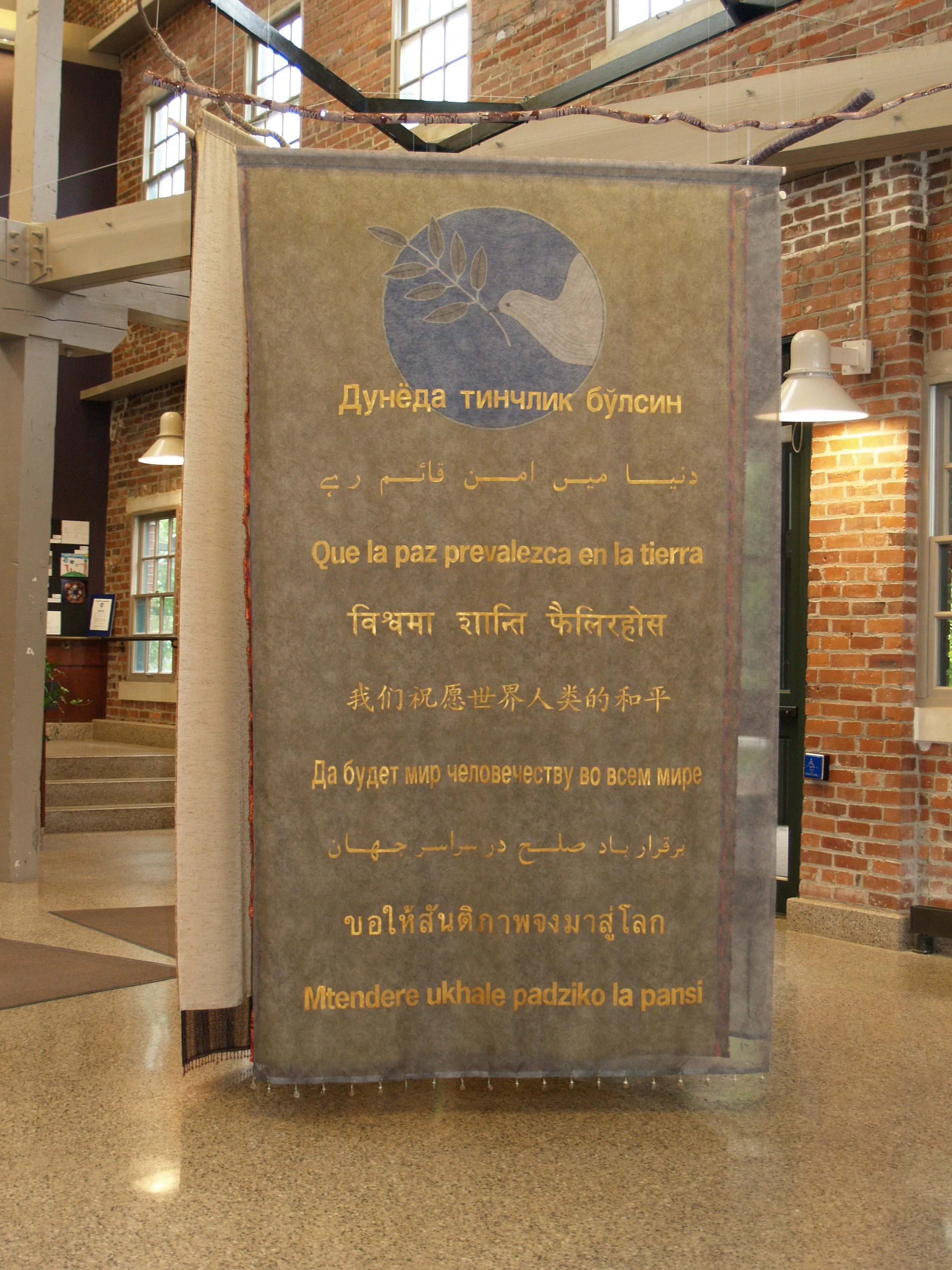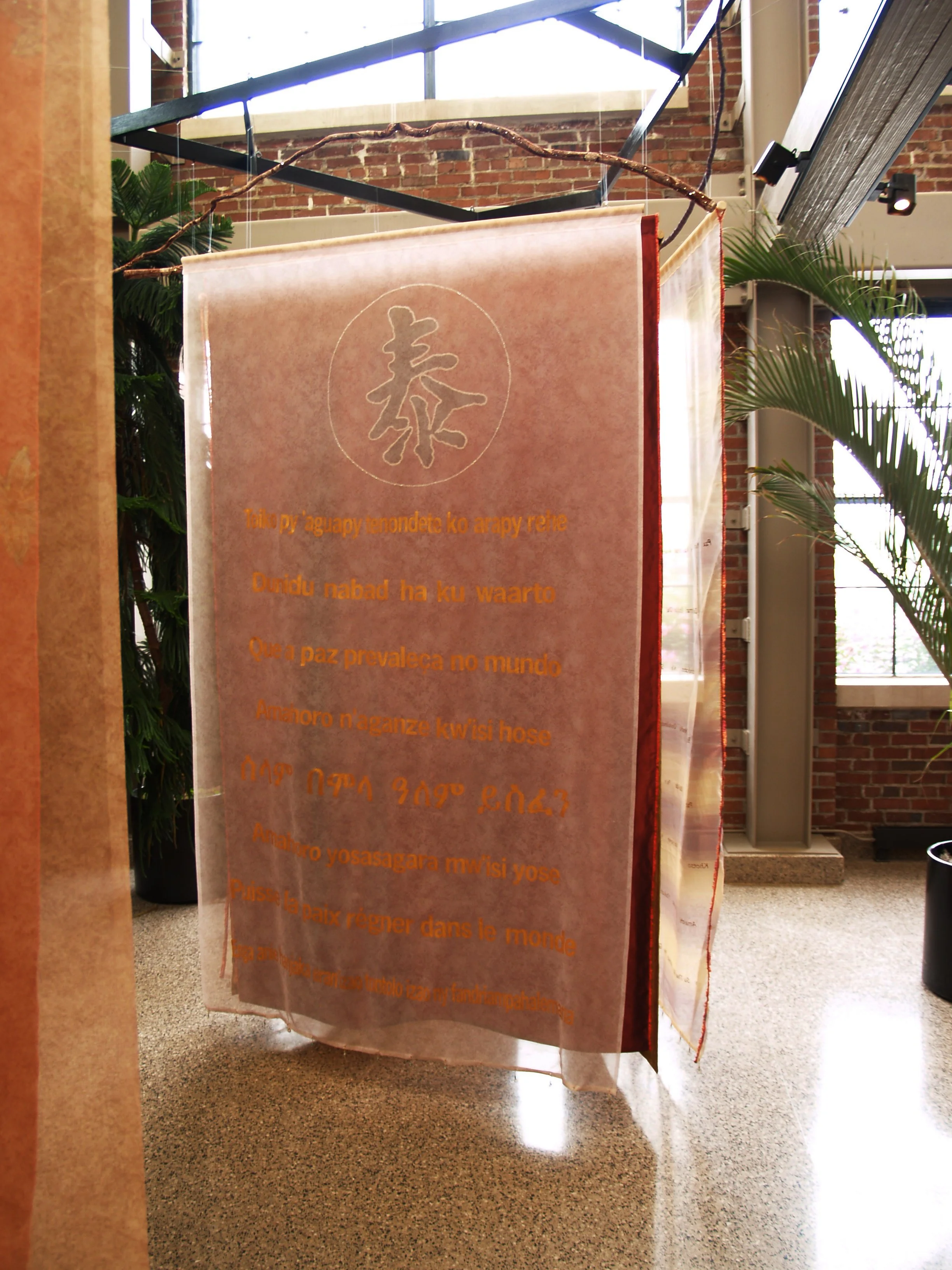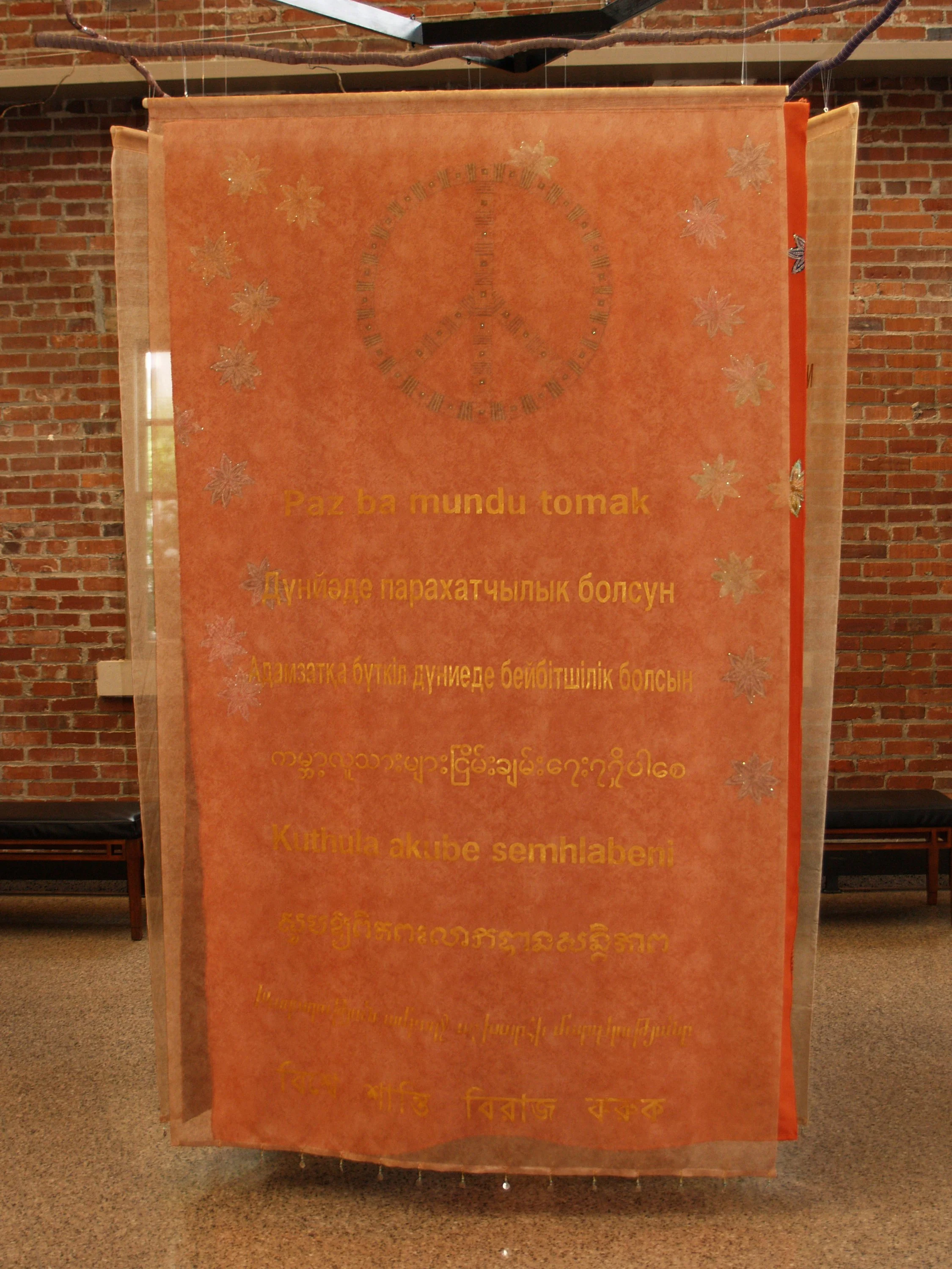 Merridee created six of these fabric panels incorporating the use of a written vision, “May peace prevail on earth” (in 50 different languages) as a way of honoring the hope connecting our one world family. The other two panels incorporate the word “peace” in 168 languages, using iridescent copper paint.