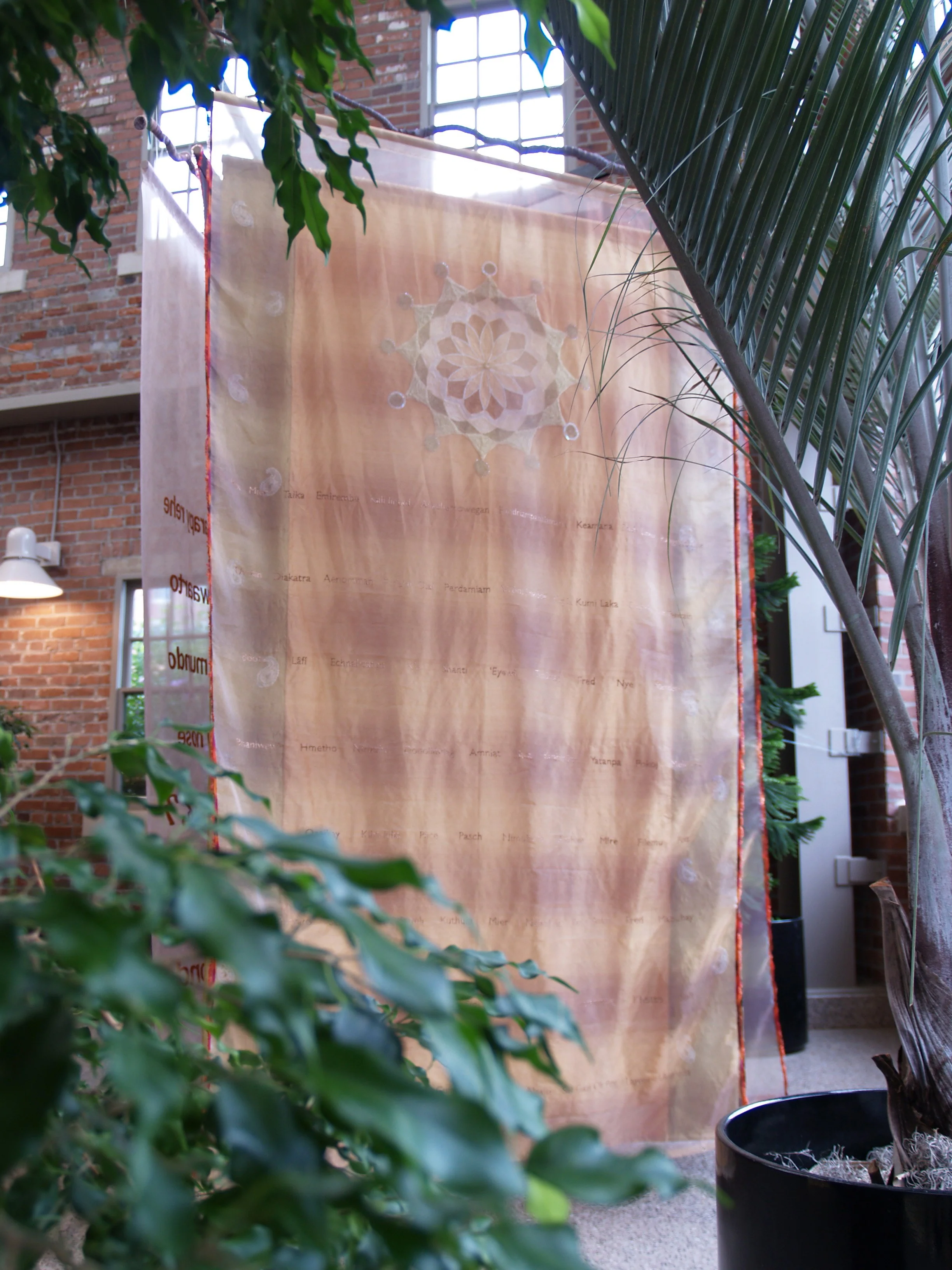 Each of the eight artworks consists of two panels of fabric with a sheer panel suspended in front of an opaque panel. The artist selected sheer fabric for the eight front panels to suggest we merely need to lift this “thin veil” to discover the peace that is always present in our heart and hearts around the World. On each back panel of opaque fabric is a mandala image that symbolizes peace from eight of our world’s cultures.